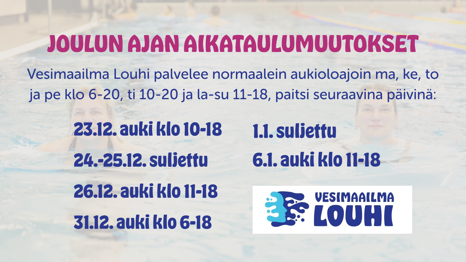 Vesimaailma Louhi palvelee normaalein aukioloajoin ma, ke, to ja pe klo 6-20, ti 10-20 ja la-su 11-18, paitsi seuraavina päivinä: